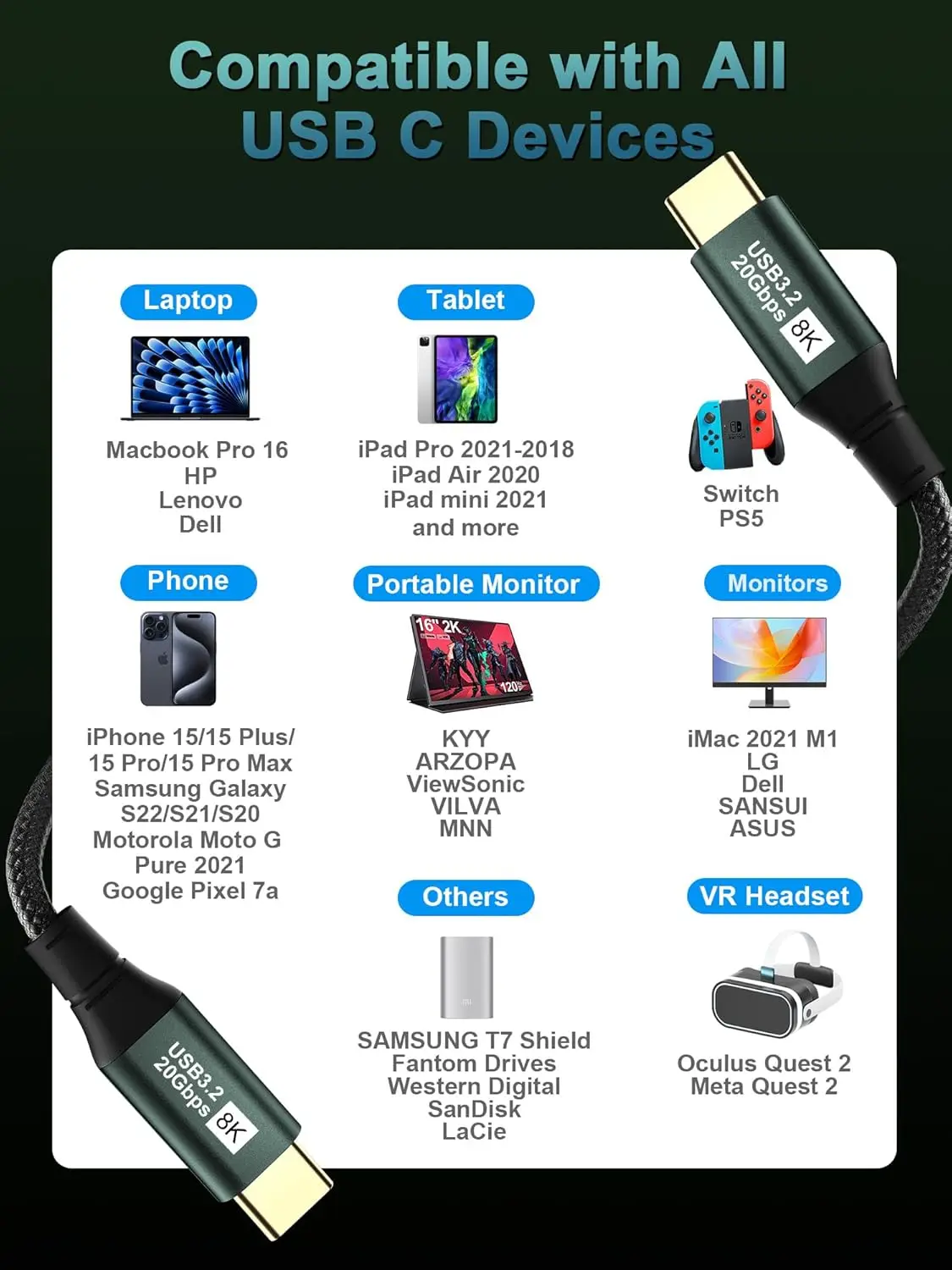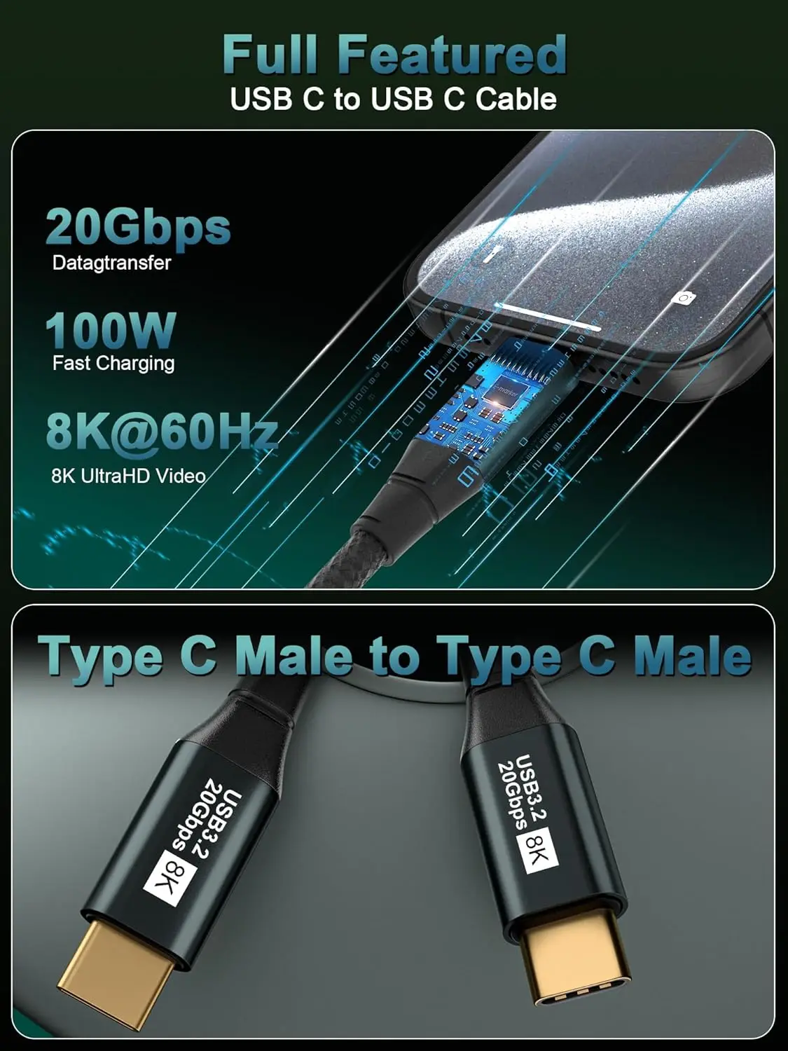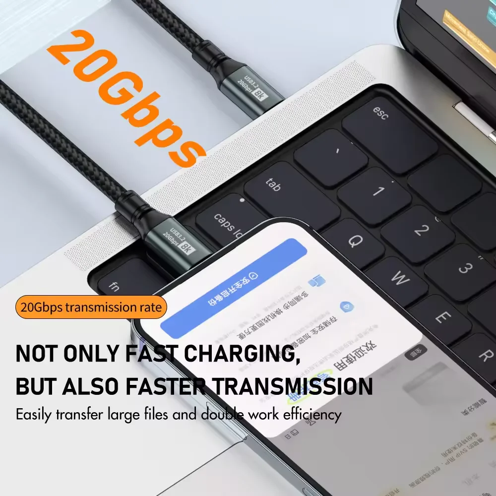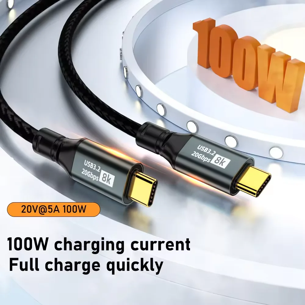 8K 60hz 20Gbps USB 3.2 Gen 2 100W 20V 5A Fast Charging Type-C Data Transfer Audio Video Cable for Mobile Phones Monitor